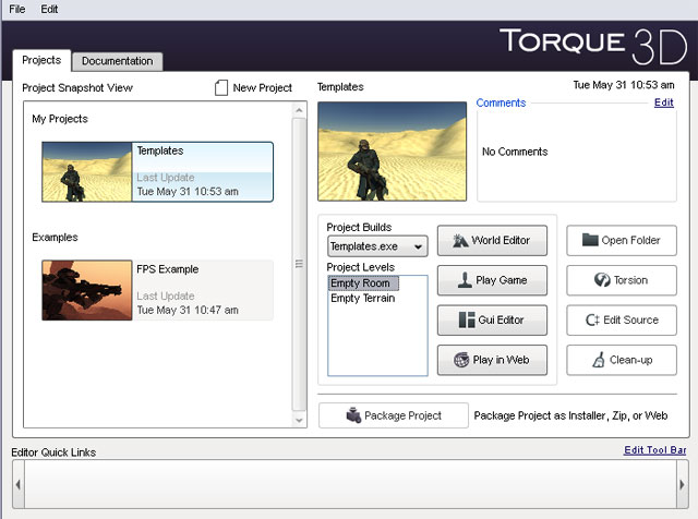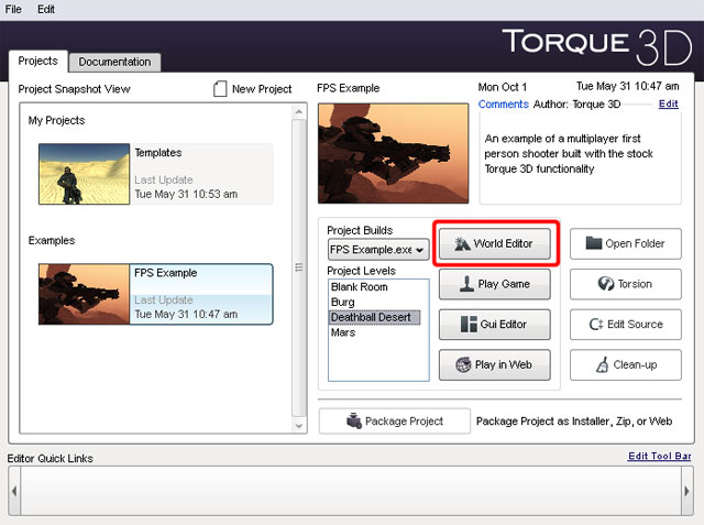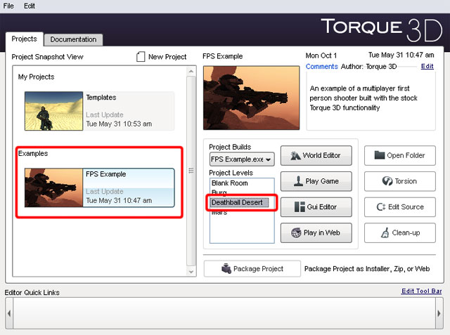 We will start off by opening the Deathball Desert Torque 3D project from the provided toolbox, but first I would advise you to back up this example project.