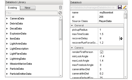 4) Select the "Existing" Tab in the DataBlock editor to return to the main list. You will notice our new datablock myBoombot Is now part of the PlayerData section.