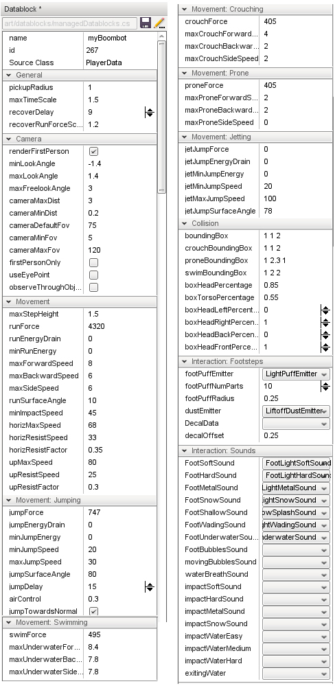 For more information on the Datablock editor, please refer to the Datablock Editor section in the T3D main document.