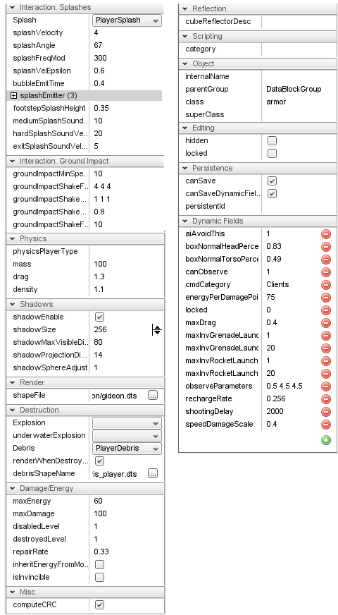 The following image show the fields present in the default player datablock.
