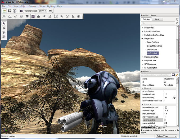 2) Open the datablock editor and select our new datablock; myBoombot datablock from the library list.