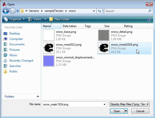 Import Terrain Height Map dialog, select the snowMask opacity layer