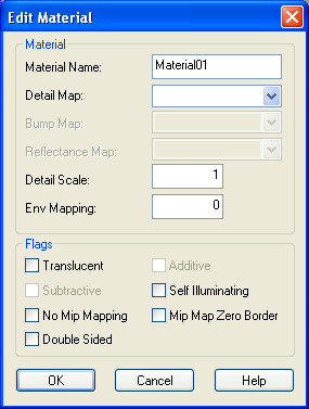 VisibilityVisibility keyframes can be defined to control the 'alpha' value of a mesh when it is rendered. Frames between keyframes are interpolated, frames outside the keyframe range are clipped to the keyframe range. Visibility ranges from 0 (invisible) to 1 (fully opaque). A sequence must have Enable Visibility set to use a meshes visibility channel. Note: Only rigid meshes (ie meshes attached to a single bone) can have their visibility animated. Collision MeshesAny mesh whose name begins with 'Collision' will be used ingame as a collision mesh. Collision meshes are normally given a negative detail level from -1 to -8 so that they are not drawn, but you can make the collision mesh visible by giving it a positive detail level. Collision meshes should use as few polygons as possible, and must be convex. The more polygons contained in the collision mesh, the greater the CPU load in determining collisions with other objects. LOS Collision MeshesAny mesh whose name begins with 'LOSCol' will be used as a line of sight collision mesh. These meshes are used for line of sight collision tests such as checking if a bullet will hit the model. These meshes are normally given a negative detail level from -9 to -16 so that they are not drawn. You can view the LOS collision mesh ingame by giving it a positive detail level. Like regular collision meshes, LOS meshes should use as few polygons as possible, and must be convex. Multires (auto-detail meshes)The exporter may be configured to automatically generate lower-detail meshes as part of the export process. The two fields of interest for each multires level is the LOD and the Percentage. The LOD field determines the size at which the multires-mesh will be displayed (just like normal geometry), and the Percentage determines the desired reduction in polygons from the original mesh. For example, adding a multires of LOD=32 and Percentage=0.5 would generate a mesh with half the number of polygons that is displayed when the shape is 32 pixels or larger on screen. MaterialsMost properties of a material can be edited using the Material Edit dialog box shown below. ![]()