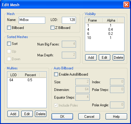 MeshesMost properties of a mesh can be edited using the Mesh Edit dialog box shown below. ![]()
