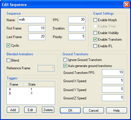 Ground TransformsGround transforms are generated by animating the bounding box. To generate ground transforms for a walking animation, you would animate the character walking forward (not in-place!), and animate the bounding box to move forward along with the player. The DTS exporter stores the node transforms relative to the bounding box transform (so the character will walk in-place in the ShowTool), and determines the natural ground speed of the character by examining how far the bounding box moves throughout the sequence. The bounding box is simply a mesh with the name 'Bounds'. It is normally attached to the Root bone. You can use the main export dialog to create the bounds mesh for you automatically. The exporter can also generate (constant speed) ground transforms automatically without having to manually animate the bounding box. Texture AnimationsThis is useful for things where the texture itself must animate. Scrolling computer monitors, waterfalls, and tank treads are just a few of the applications for animated texture coordinates. Note: Texture animation is not yet supported by this exporter. Non-smooth texture animation can be faked using IFL materials. See IFL Materials for details. Visibility ChannelA mesh can define a visibility channel (see Meshes). Sequences that have the enableVis flag set can use this set of keyframes to control the transparency of the mesh during the sequence. This is useful for parts of the model that you may only wish to show during certain animations. TriggersTriggers can be added to and removed from a sequence by using the Add and Remove buttons in the Edit Sequence dialog. You may define up to 30 independent trigger states per sequence. TriggerFrame is the frame number on which a trigger event occurs. TriggerState defines the state of a trigger. There is one triggerFrame and triggerState per trigger. Trigger numbering starts at 0. For example, triggerFrame0 and triggerState0 are the first trigger, triggerFrame1 and triggerState1 are the second trigger, etc. Note that when you delete triggers from the list, all of the remaining triggers are renumbered starting from 0. Their frame and state attributes are retained. Any sequence that makes use of triggers must have the ignoreGround checkbox cleared, or the triggers will not work ingame. DSQ ExportExporting animations to a DSQ file allows you to share animations with multiple DTS shapes. DSQ files are loaded at runtime via script. e.g.