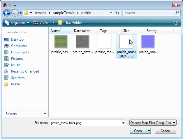 Next, click on the + button next to Texture Map to open another file browser. This is where we are going to add our opacity layers. Start by locating the prairie mask (game/art/terrains/sampleTerrain/prairie/prairie_maskX.png). You can choose the 512 or 1024, but you have to stick with that resolution for the rest of the files we will be adding.