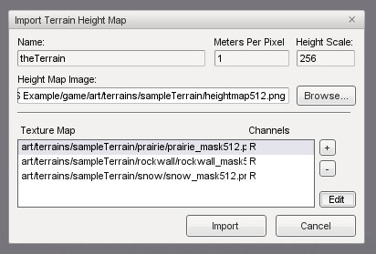 Keep the name default value, theTerrain. Click the browse button near Height Map Image to open a file browser dialog. Go to where you saved the terrain files, game/art/terrains/sampleTerrain and open the heightmap512.png.