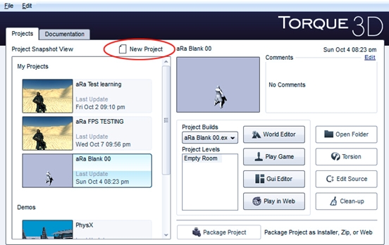 If you are new to Torque 3D, start with a new Blank project. The following projects will fit into any existing development environment.