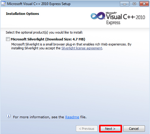 1) Select the "Visual C++ 2010 Express" option, and then select your desired language.