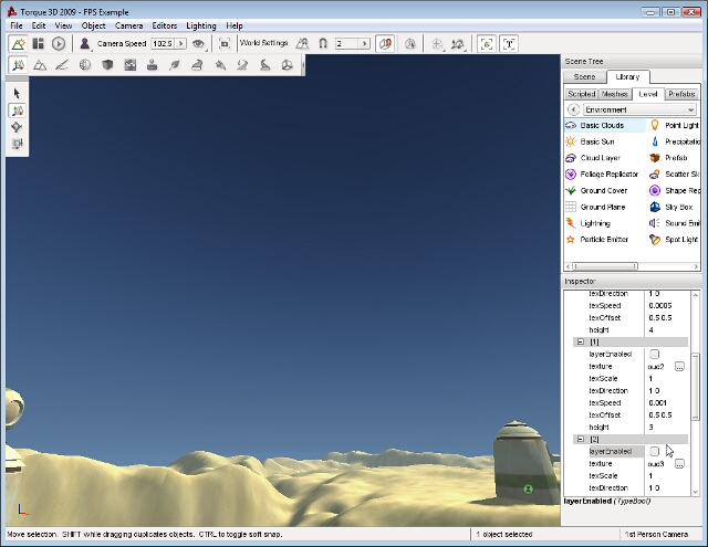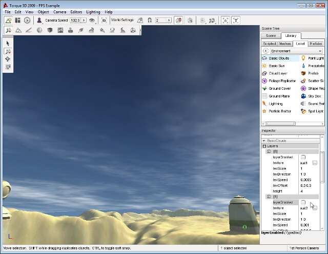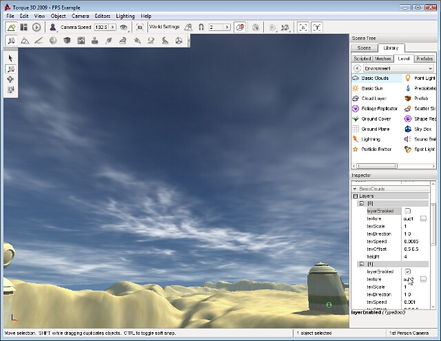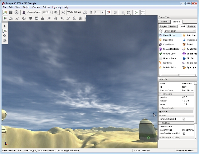 Enter a name for your clouds object then click the Create New button. A Basic Clouds object will be added to your level. Three separate cloud layers will be rendering and moving across the sky slowly: