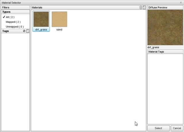 With the above information in mind, you can assign the GroundCover to terrain materials. Scroll through the properties until you get to Types[0]. Click on the box icon in the layer field. The Material Selector for terrains should appear. Select a material such as the dirt_grass shown here:
