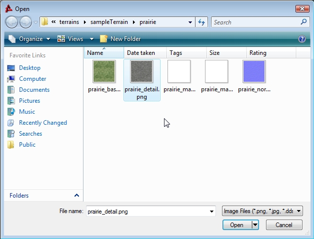 Click the browse button to the right of the Height Map Image box to open a file browser dialog. Navigate to where your terrain files are located, select the desired heightmap PNG file, then click Open. The selected heightmap file will be entered in the Height Map Image box.