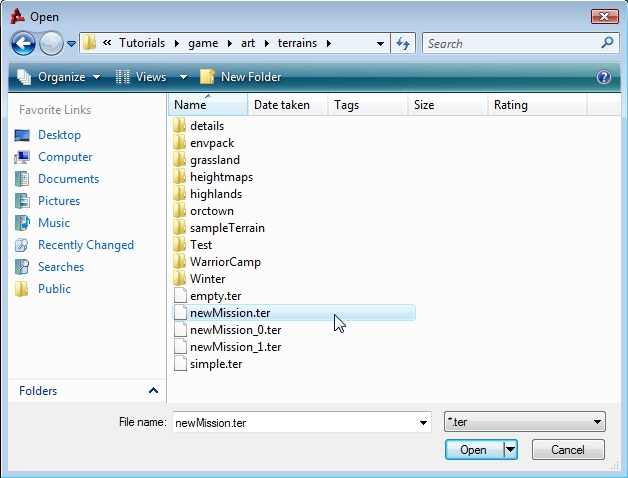 Terrain files are named with a .ter extension. The .ter file type is a proprietary format that contains terrain data understood by Torque 3D. Locating a .ter file then clicking Open/OK will cause it to be selected as the Terrain file to be loaded.