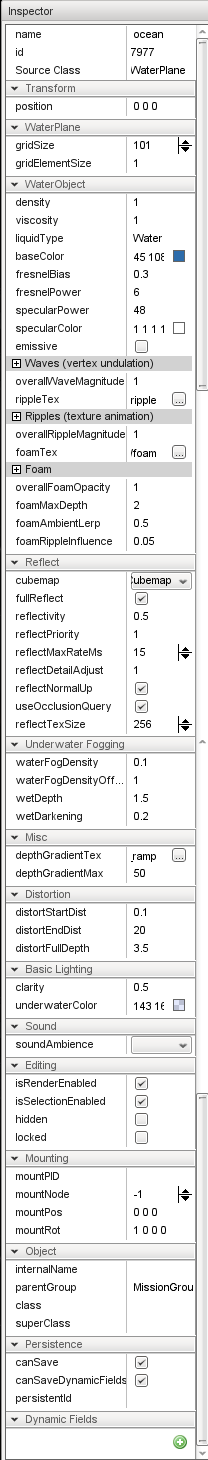 baseColor: TypeColorI. Changes color of water fog, which is what gives the water its color appearance.