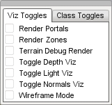 Opens the Visibility Layers dialog which toggles debug rendering modes;