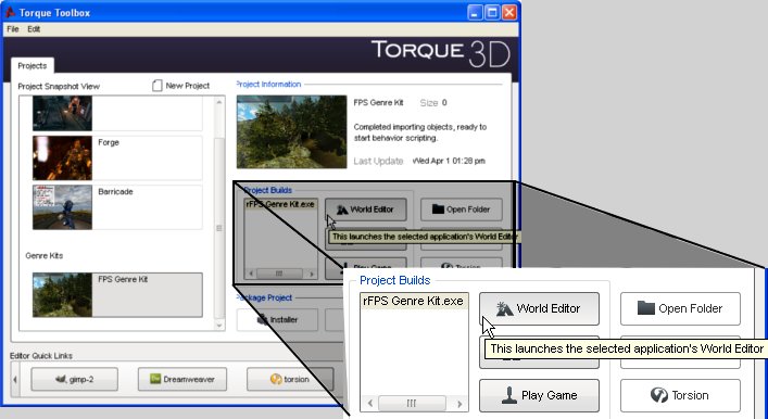 There are two ways to open the World Editor: (1) by using the Torque 3D Toolbox utility or (2) by using hot keys from within a running Torque game. You will likely use both methods during development.