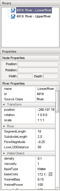 On the right side of the screen are three panes. At the top is the Rivers pane which contains a list of all the rivers currently in the level, if any are present. In the middle is the River Nodes pane which displays the properties of the currently selected river control point. At the bottom is the Properties Pane which displays the properties of the currently selected river.