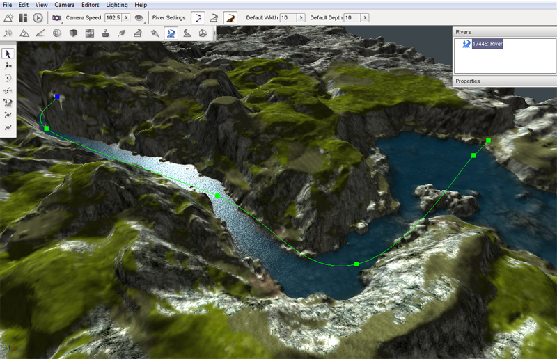 The editor has two main parts, one where you can add and manipulate the river nodes (control points) for creation, the other for adjusting the river properties to create the river style (depth, width, flow, ripples etc).