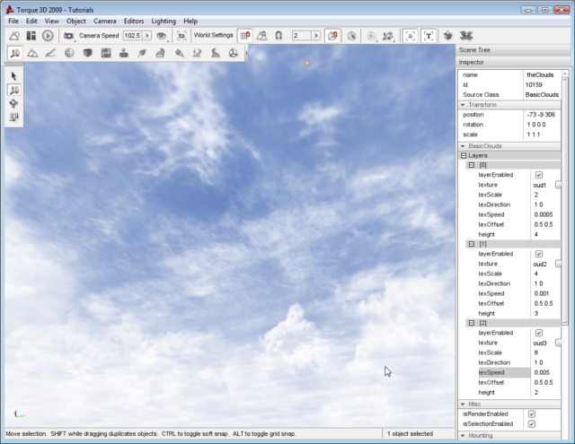 The stock object will populate the three layers with sample cloud images. These are located by default in /My Projects/<Project>/game/core/art/skies. If for some reason you do not have these assets, you can download them by