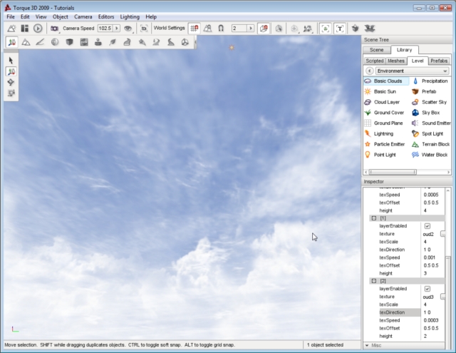Click Create New and the Basic Clouds object will be added to your level. Three separate cloud layers will be rendering and moving across the sky slowly: