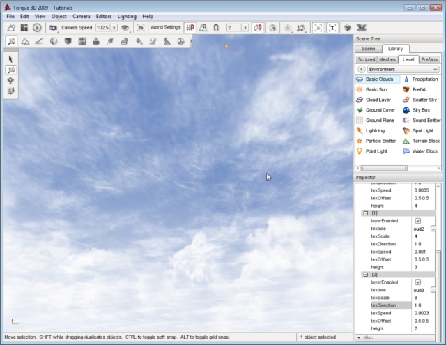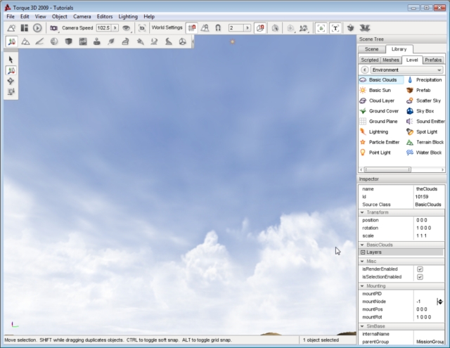 When you are ready to add clouds start by switching to the Library tab in the Scene Tree panel. Click on the Level tab then select the environment folder. Once that is open, locate the Basic Clouds object (not the Cloud Layer object):