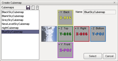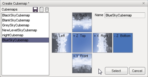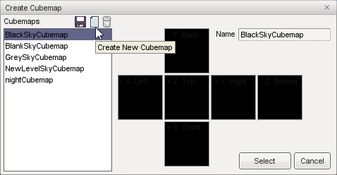 The Create Cubemap dialog will appear. From here you can select an existing sky cubemap or create a new one, which is what we are going to do. At the top of the cubemap list you will find three icons. Click on the page icon to create a new cubemap: