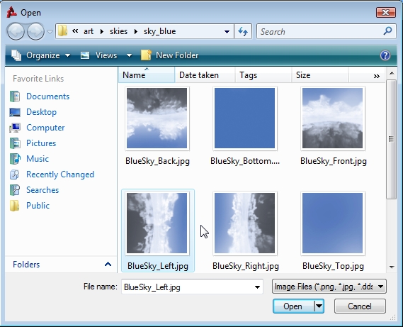 Navigate to the directory where your sky art is located, click on the blue_0004.jpg file then click the Open button. The sky image will be placed on the left section of your cubemap: