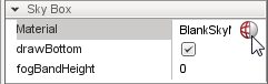 Switch back to the object editor (F1 shortcut) and make sure your Skybox object is selected. Scroll down to the Skybox section of the properties, then click on the Material Selector icon in the Material field. When the Material Selector appears, locate the BlueSky material and click Select.