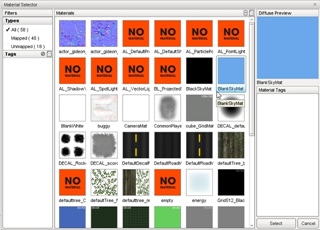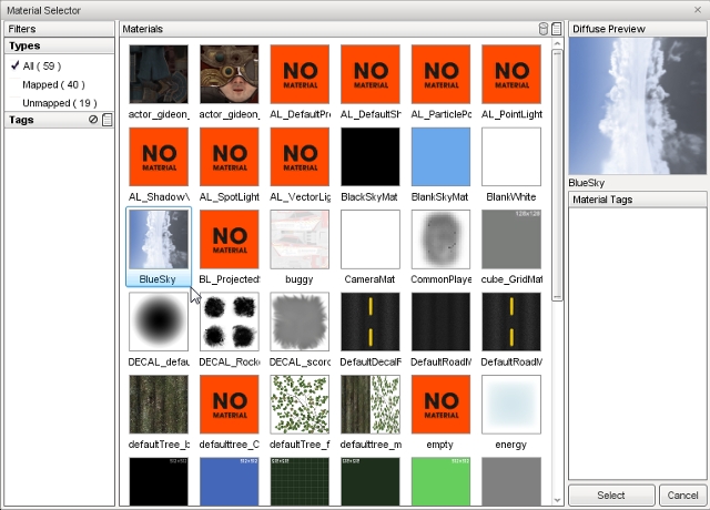 The Material Selector will show all of the materials that could be found by the engine. Look for one containing "Sky" in the description (e.g. BlankSkyMat). Select it by single clicking on the image, then press the Select button.