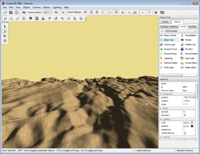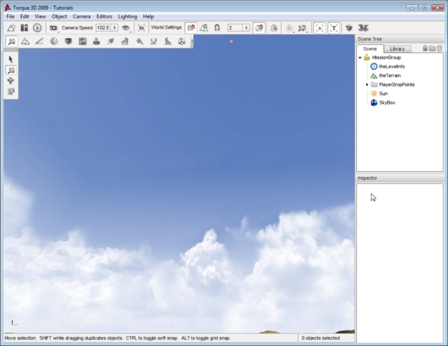 Start by switching to the Object Editor tool. Locate the Scene Tree panel, then select the Scene tab. Inside the MissionGroup locate any objects that contain the words sky, sun, or clouds in them. Select the object, then delete it by pushing the delete key, or by clicking the trash can icon.