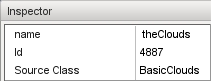 Additional properties can be changed with the Inspector pane. To change a Basic Clouds properties using the Inspector Pane click the Scene tab, then click the name of your new Basic Cloud object. The Inspector pane will update to display the current properties of your new sun.