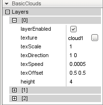 While editing your Basic Clouds object, you may discover the need to view and edit individual layers. Open the BasicClouds section of the Inspector pane. Under the Layers sub-section you will find three layers labeled by an index. Each index refers to a layer and determines rendering order. The