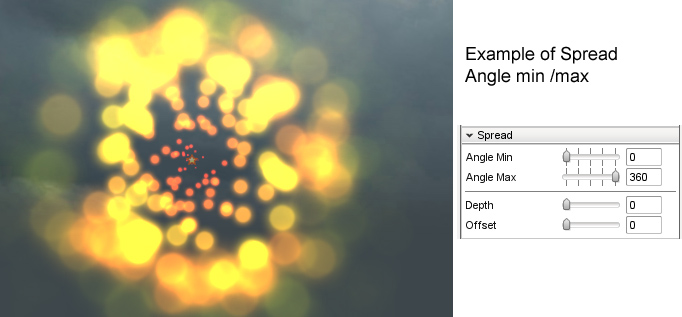 Depth: The depth of the released pattern. A setting of 360 will create a spherical spread pattern when Angle Max is set to 360.
