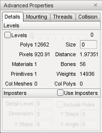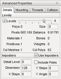 The Details Tab of the Advanced Properties window allows imposter detail levels to be added and edited. Imposters are a series of snapshots of the object from various camera angles which are rendered instead of the object when this detail level is selected. An imposter detail level is usually the last visible detail level (smallest positive size value).