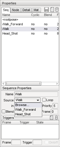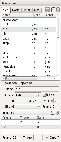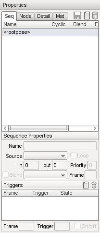 The Sequences tab (displayed as "Seq" onscreen) lists the sequences available in the shape, as well as a number of different properties about the selected sequence. In addition, the 'root' (non-animated) pose can be selected for display in the Shape View window.
