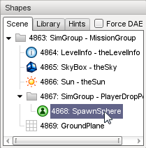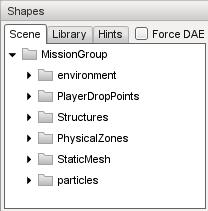 - Select an object using the Scene tree in the Shape Editor. This view is the same as that used in the World Editor, and provides a convenient way to select objects that have already been placed in the level. Note that the Shape Editor only allows selection of objects that use DTS or COLLADA files; selection of Interior or ConvexShape objects will be ignored.