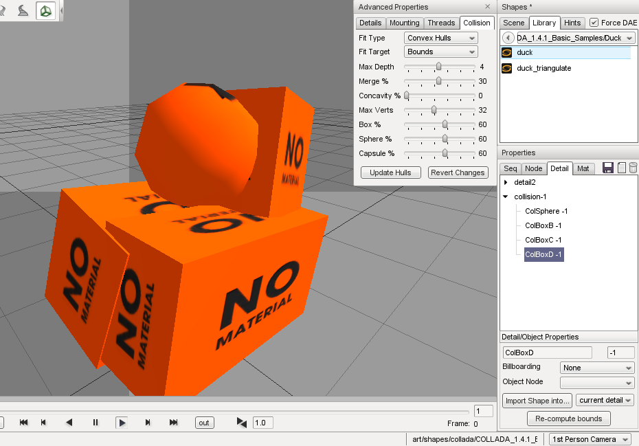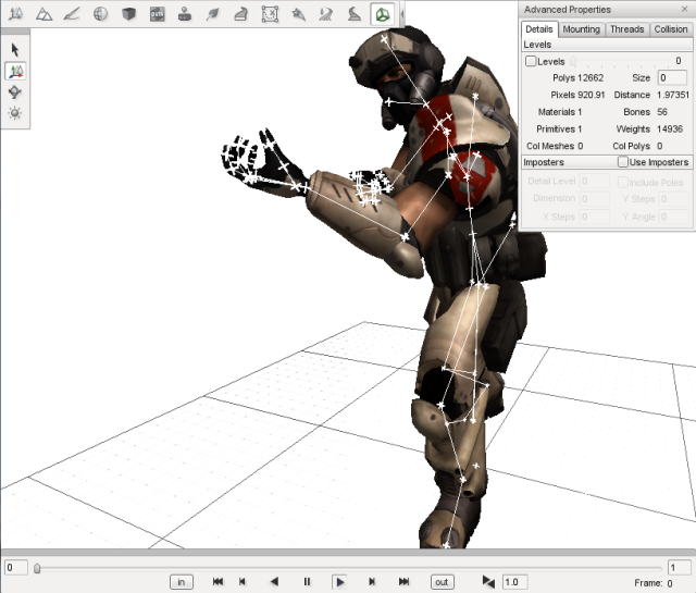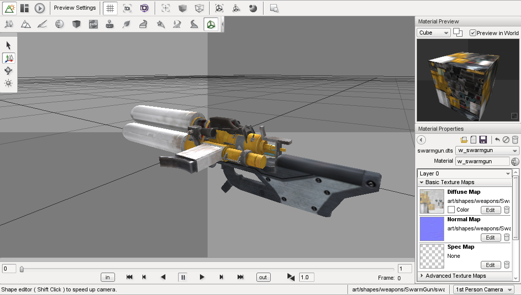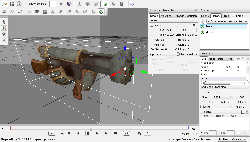 The Shape Editor is used to view and edit the shapes that can be placed into your levels using the Object Editor. The Shape Editor can view and manipulate files in both the DTS (.dts) and COLLADA (.dae) formats. It can be used to quickly preview shapes before they are added to a level, and provides an easy way to add, edit and delete animation sequences, skeleton nodes, and rendering detail levels.