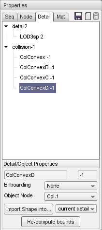 The Shape Editor can auto-fit geometry to a part or the whole of the shape for use in collision checking. Each time the settings are changed, the geometry in detail size -1 is replaced with the new auto-fit geometry. The node Col-1 (and any child nodes) may also be modified.