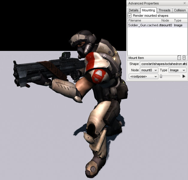 The Mounting Tab of the Advanced Properties window allows you to attach other models to the main shape to visualise how they would look in-game, or to fine tune the position and rotation of mount nodes. When a model is mounted, it inherits the position and rotation of the node it is mounted to and will animate along with it.