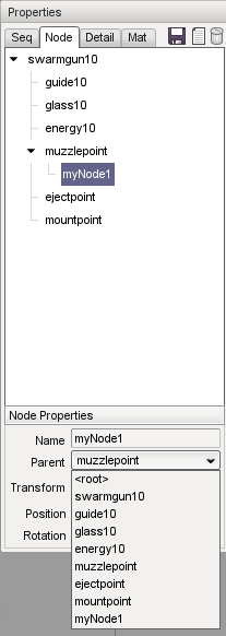 To add a node, simply press the New Node button in the top right corner of the Properties panel. If a node is currently selected, it will automatically be used as the initial parent for the new node. A new parent node can be selected using the dropdown menu. Renaming the node is as simple as typing a new name in the edit box and pressing