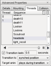 The Threads Tab of the Advanced Properties window allows you to set up threads to play multiple sequences simultaneously, and to view transitions between sequences. A set of animation sequence playback controls that mirror the main animation controls are provided as a convenience so you don't have to mouse too far to test out a new thread. The mini-timeline slider is also used to indicate sequence transition information.
