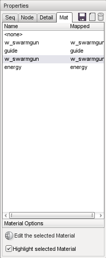 The Properties window is where you can view and edit the sequences, nodes, detail levels and materials in the shape. The top right corner has three buttons, which do the following: