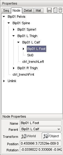 There are two ways to edit node transforms: The first way is to manually edit the position and rotation values in the Node Property panel. This method is most useful when trying to set an explicit value. For example, you may require that a node be offset by exactly 2 units in the X direction from its parent node. Node transforms can be specified as either relative-to-parent (Object mode) or relative-to-origin (World mode).