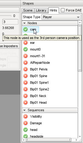 The Shape Selector panel is used to choose a shape file for viewing and editing. It is composed of 3 tabs: Scene, Library and Hints. The Scene tab allows you to select a shape that has been placed in the current level. The Library tab allows you to browse and select any DTS or COLLADA shape from your project's art folder. Finally, the Hints tab displays information about which nodes and sequences are expected by Torque for a given type of shape object.