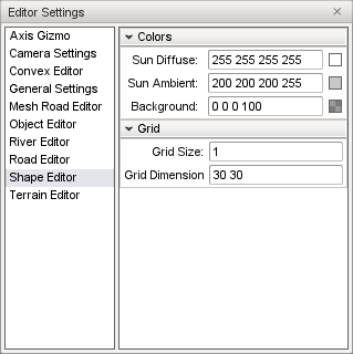 The Shape Editor settings dialog can be accessed from the main menu by selecting Edit Editor Settings, and allows the appearance of the editor to be customized. These settings are persistent and will be automatically saved and restored between sessions.