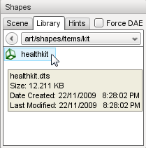 - Select a shape file using the Library tab. This view is the same as that used in the World Editor Meshes tab, and allows you to browse the DTS and COLLADA assets in your project's art folder. This method allows you to view and edit shape files that have not yet been placed in the level.
