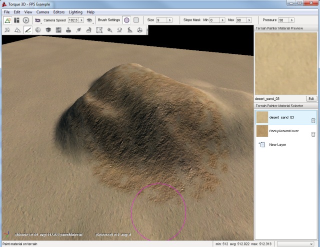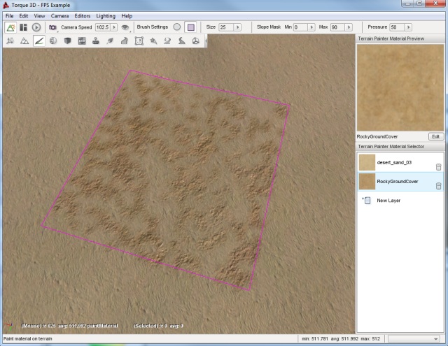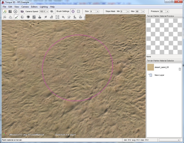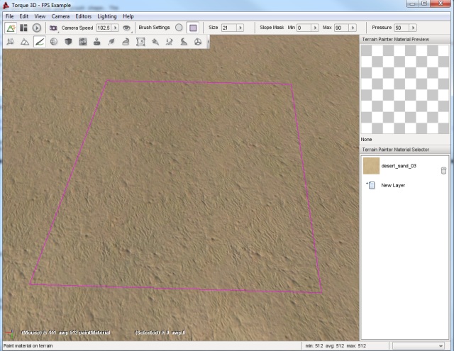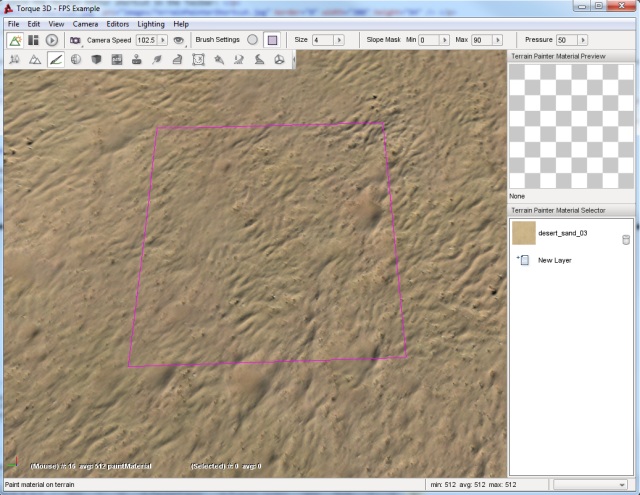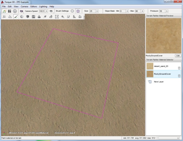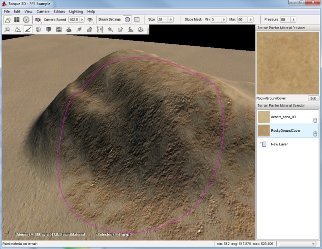 Now, on to learning to paint. Make sure you have the new material selected in the Terrain Painter Material Selector. So we can more easily see the modifications we are about to make, set your brush size to about 25.