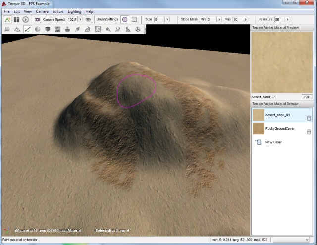 This is a good time to take a look behind the scenes to understand a little of how Torque 3D organizes materials and how it uses them for other operations to your advantage.What you can not see in the interface is that the system has associated each of the TerrainMaterials in your palette with a numbered layer. Throughout these documents you will see, or may have already seen, that material layers are used to control aspects of object placement such as which layer automatic object placement will occur on.