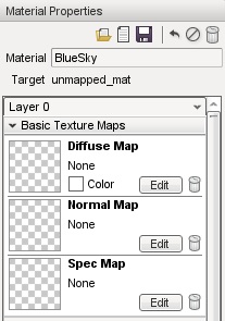 Cubemaps do not make use of diffuse, normal, or spec maps, so those can be deleted. Click on the trash bin icon in each of the following groups - Diffuse Map, Normal Map, and Spec Map. This will delete the material associated with that group if it had one. The gray and white checkerboard pattern means that no material is assigned to a group. Change the name of your material by entering BlueSky in the text box next to the Mission label, then pressing the Enter key on the keyboard, then click the save button - the little floppy disk icon at the top.